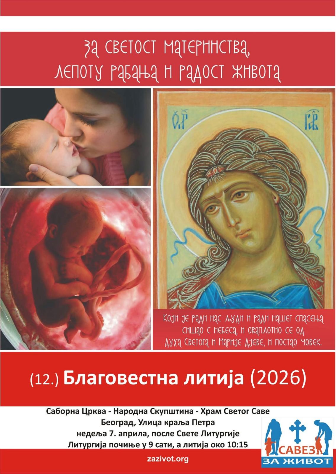 12. Благовестна литија од Саборне цркве у Београду до Народне скупштине и Храма Светог Саве, на велики празник Благовести, у уторак 7. априла, после Литургије.